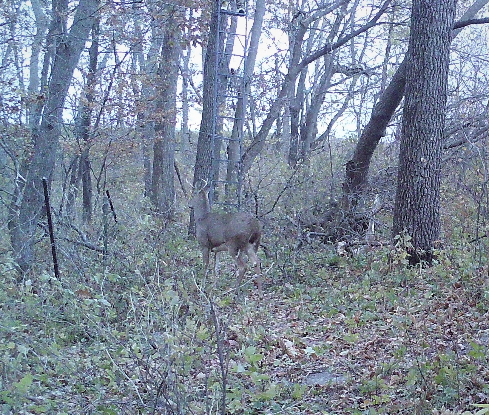 The four-point buck was standing right below Heather’s ladder stand at the edge of the woods. About 11 feet away, as evidenced by the trail camera photo. A clueless yearling fork horn, just loafing along. Couldn’t possibly miss this shot. Unless the scope on the muzzle-loader rifle was inexplicably set on nine-power magnification.